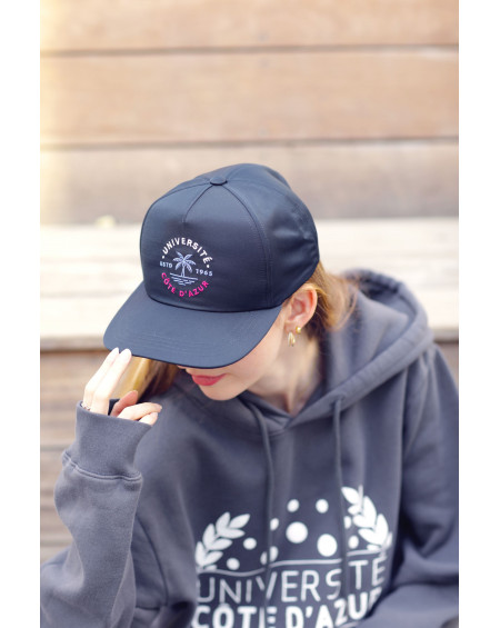 Ses finitions —panneau avant rigide renforcé, visière courbée, boucle métal canon de fusil—soulignent une conception soignée, réalisée avec savoir-faire au Portugal. Et sur le panneau avant, une broderie discrète mais symbolique : Université Côte d’Azur — estb. 1965.