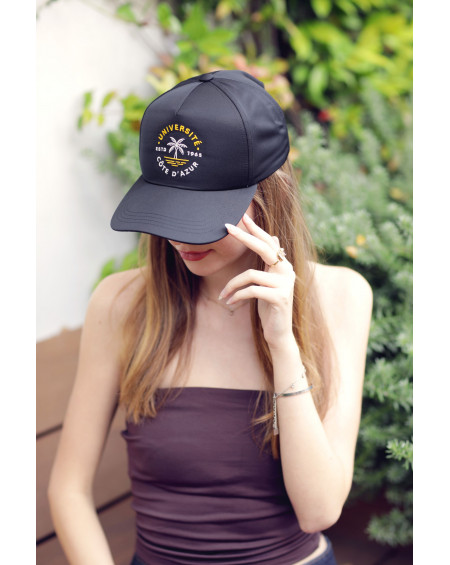 Ses finitions —panneau avant rigide renforcé, visière courbée, boucle métal canon de fusil—soulignent une conception soignée, réalisée avec savoir-faire au Portugal. Et sur le panneau avant, une broderie discrète mais symbolique : Université Côte d’Azur — estb. 1965.